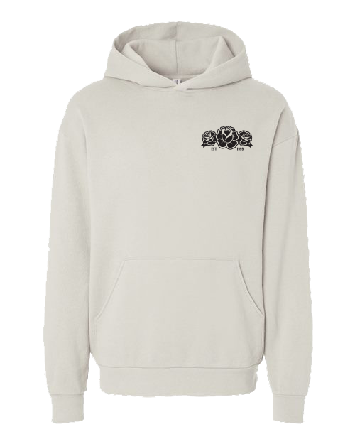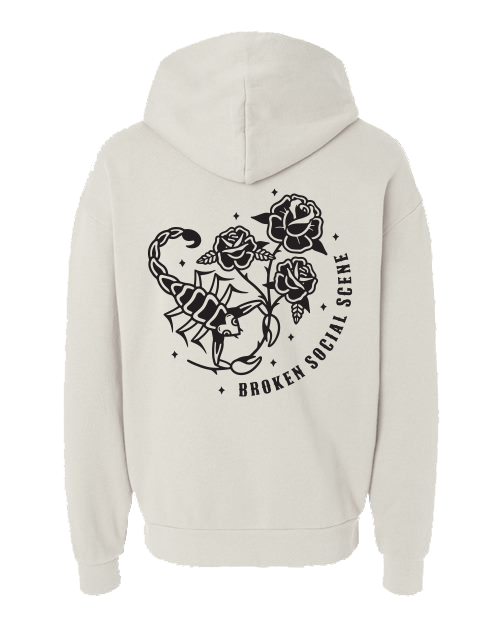 80/20 ring-spun cotton/polyester blend fleece with 100% cotton face, oversized fit hoodie with Broken Social Scene emblem on the left chest and scorpion design on the back.